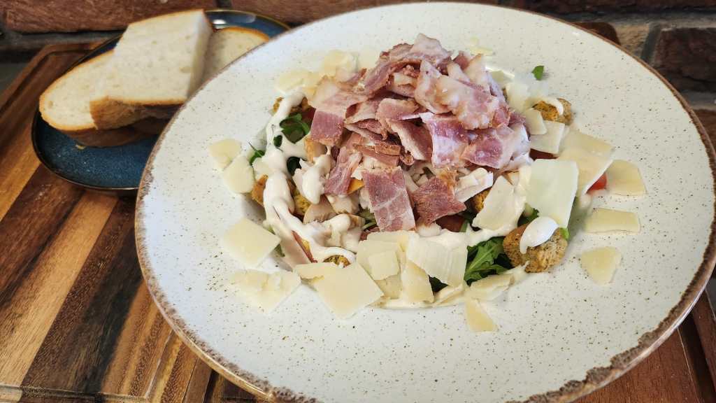 Rocket, Cherry Tomatoes, Red Onion, Olives, Parmigiano Reggiano, Croutons, Caesar Dressing, Olive Oil