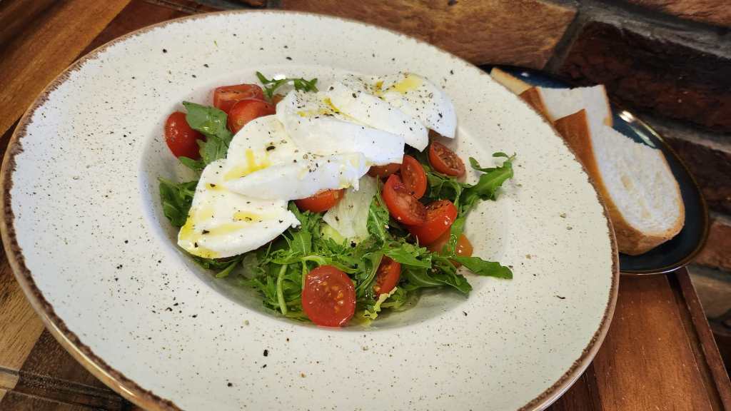 Bresaola Cured Beef, Stracciatella Cheese, Cherry Tomatoes, Sweet Drop Peppers, Salt, Pepper, Olive Oil