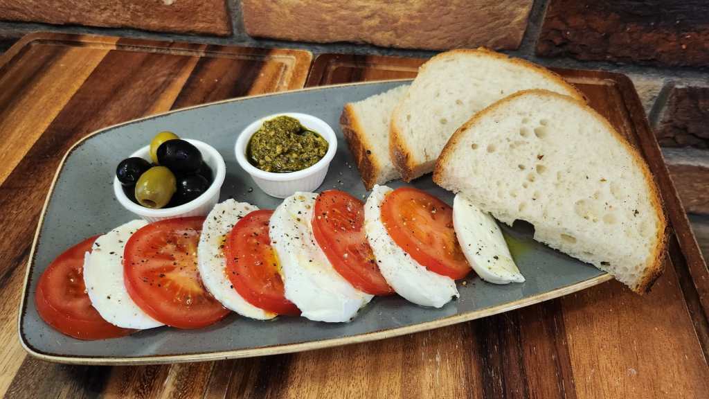 Buffalo Mozzarella, Vine Tomatoes, Italian Olives, Basil Pesto & Olive Oil