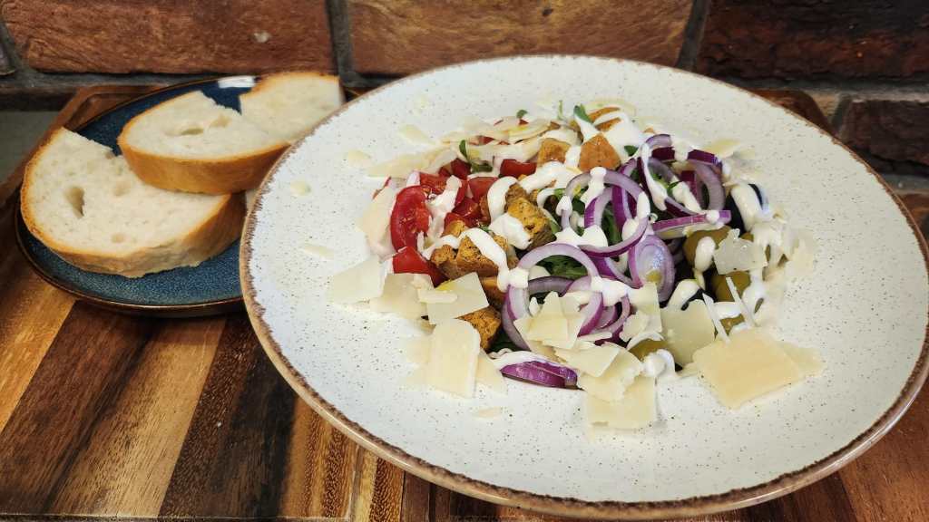 Lettuce, Rocket, Tomatoes, Drop Peppers, Gherkins, Red Onion, Olives, Olive Oil