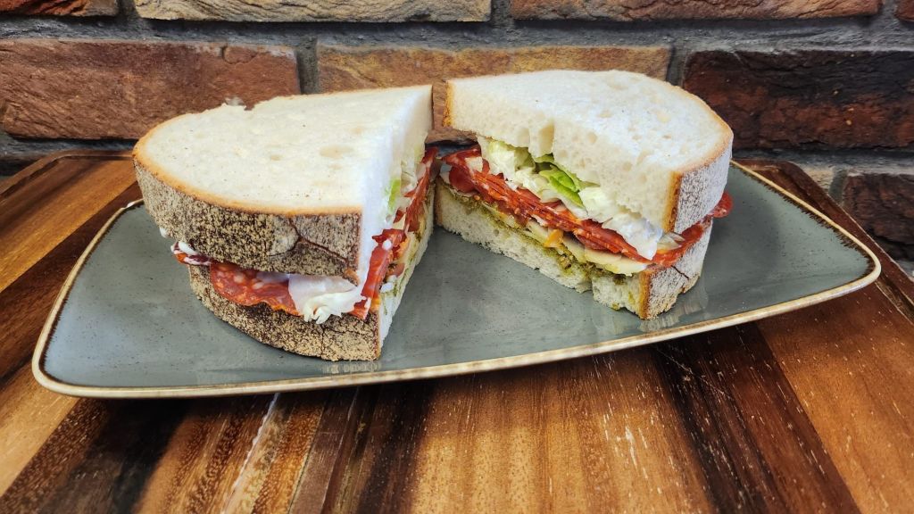 Spianata Spicy Salami, Basil Pesto, Parmigiano Reggiano, Cherry Tomatoes, Lettuce